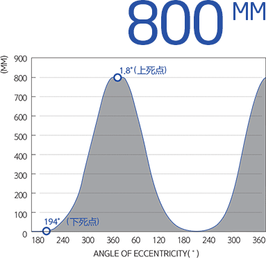 使用了肘杆(KNUCKLE-JOINT)压力机的驱动方式并在连杆(CONNECTING ROD)部分增加了连接关节,因此滑块下降时呈现肘杆式压力机的柔和的运动曲线形态,滑块上升时可像曲柄压力机一样进行快速的归位。这样的滑块运动曲线可在产品成型时减少压力机冲击速度(Reduced impact speed)。由此即可延长压力机的加压成型时间,可生产前、后方挤压的高品质的产品并提高生产速度。